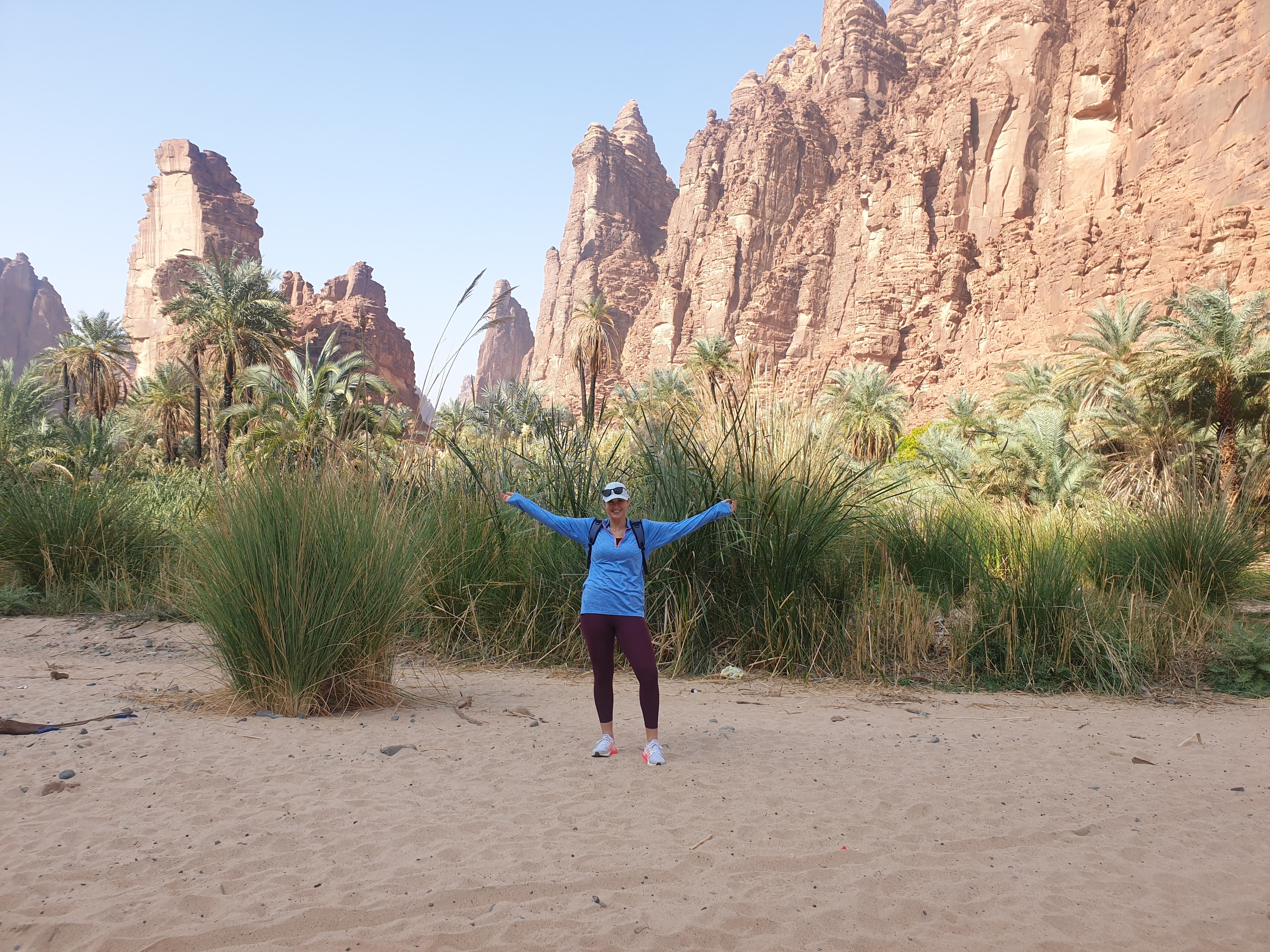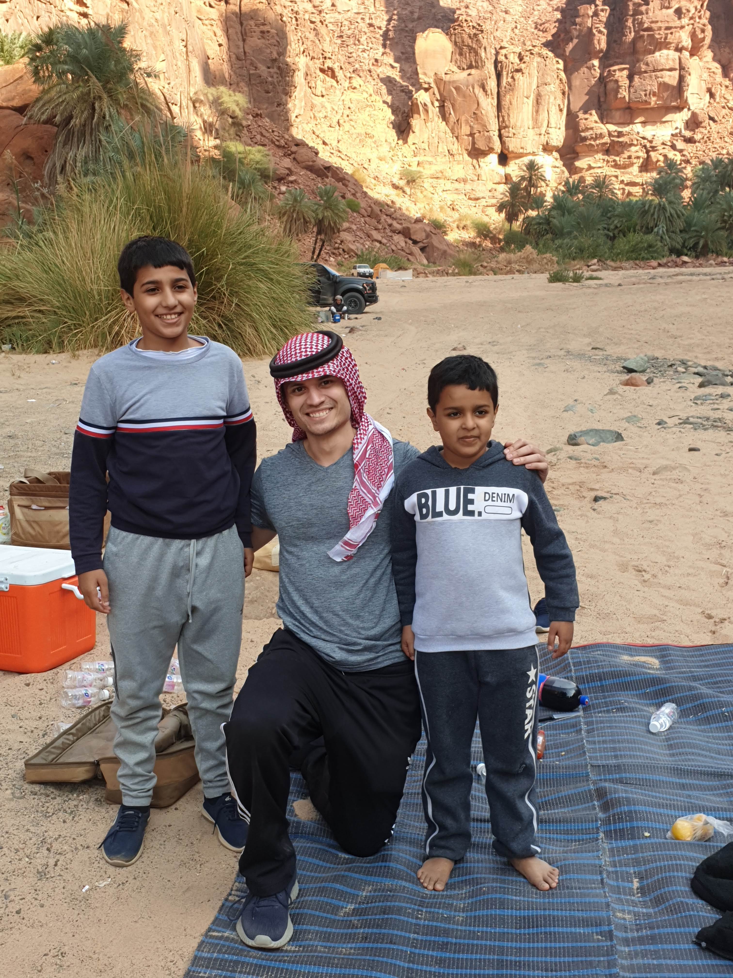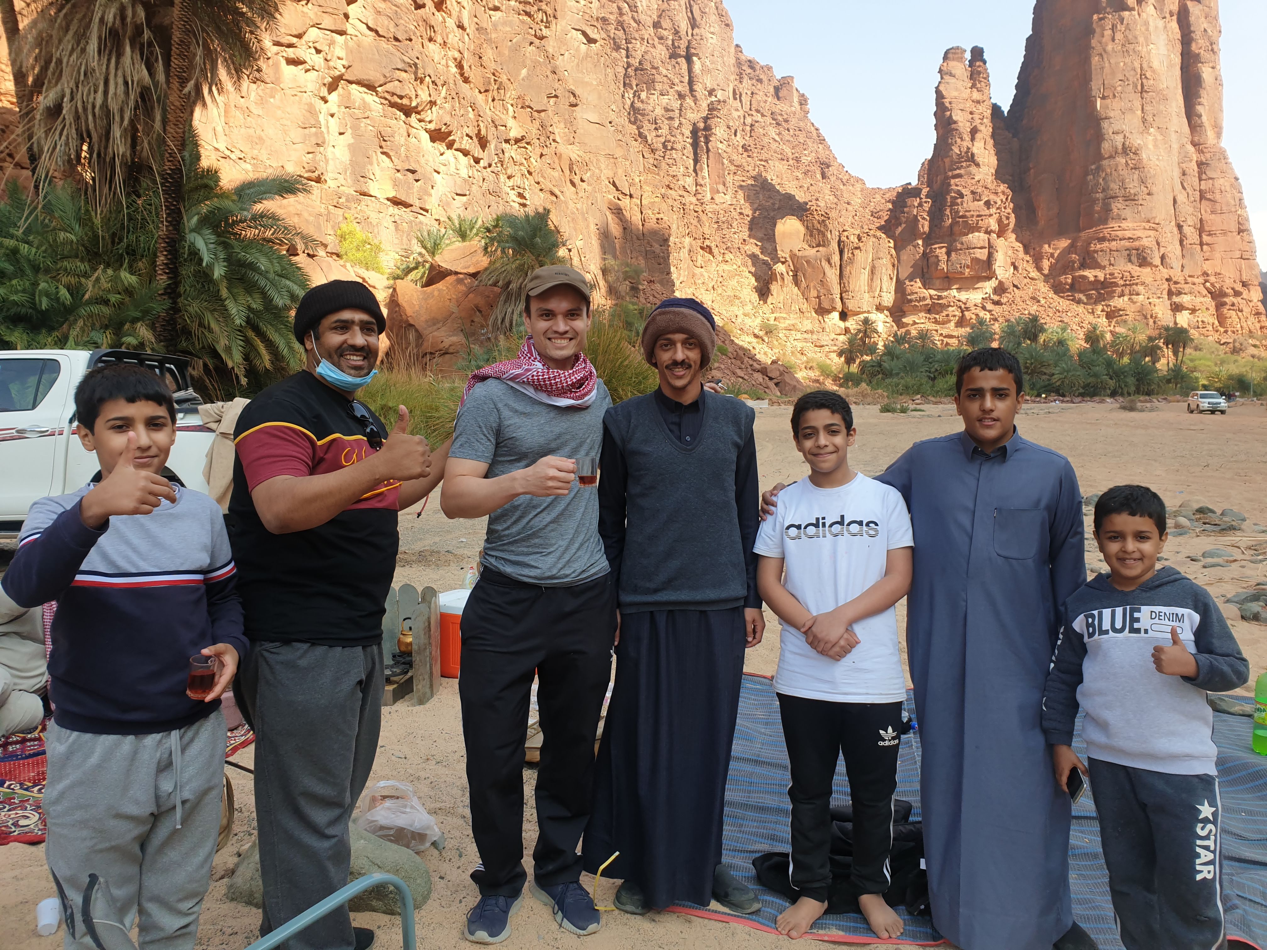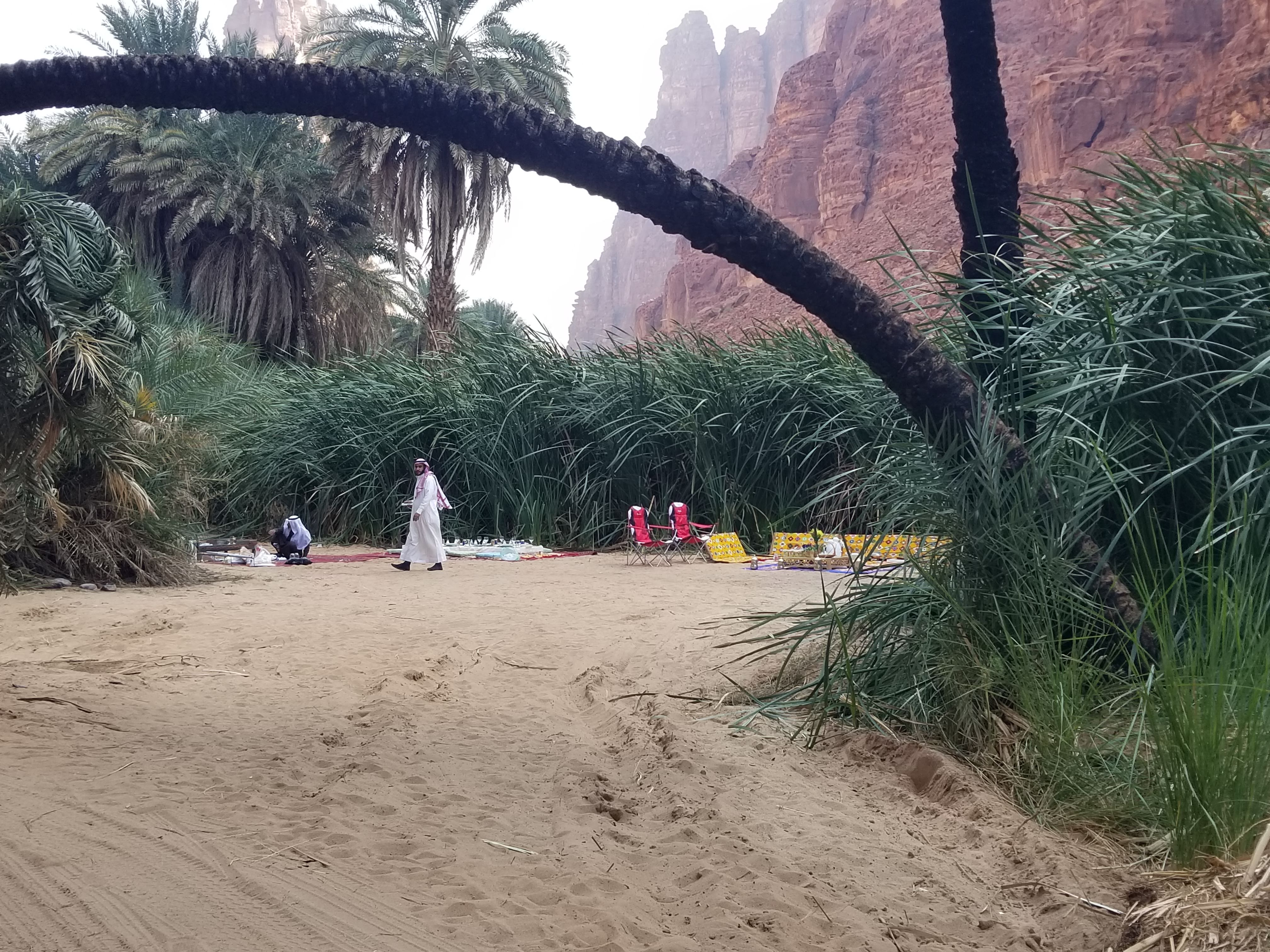 In Tabuk, we stayed at the Garden View Inn for two nights, and embarked on a 2 hour and 30 minute drive to the acclaimed Wadi Al-Disah. This beautiful mountainous valley, lined with limestone rock formations, is a hidden gem in the northwestern region of Saudi Arabia. Driving there is a breeze and you can park on the flattened sand towards the entrance of the Wadi, then walk deeper into the Oasis. The sand evolves and softens as you step deeper into the Wadi and explore. Pillars of red, rocky stone tower over the date palms as you take each step on sand that rivals that of the most pristine Hawaiian beaches. It is a dream-like experience I will never forget. Most foreign tourists don’t yet know about the Wadi and it’s predominantly visited by Saudi nationals. The Oud smells mix with the barbeque smoke and from one Bedouin camp to another, the laughter echoed throughout the valley as I continued walking further into the Wadi. People were cooking corn, rice, soup, and camping with their families. I had invitations from everybody to join them and eat dates, or hitch a ride in the back of their Toyota Landi from the inner-Wadi to our car. We ended up chatting with a down-to-earth family from Abha that was camping in the Wadi for the weekend. They offered us tasty Arabic tea, dates and loved hearing about our home-towns. One of the family members insisted I take his keffiyah (the head-dress worn my Muslim men) upon leaving as you can see in the pictures below. I love memorabilia for me to look back on for years to come, and was eternally grateful for their benevolence.