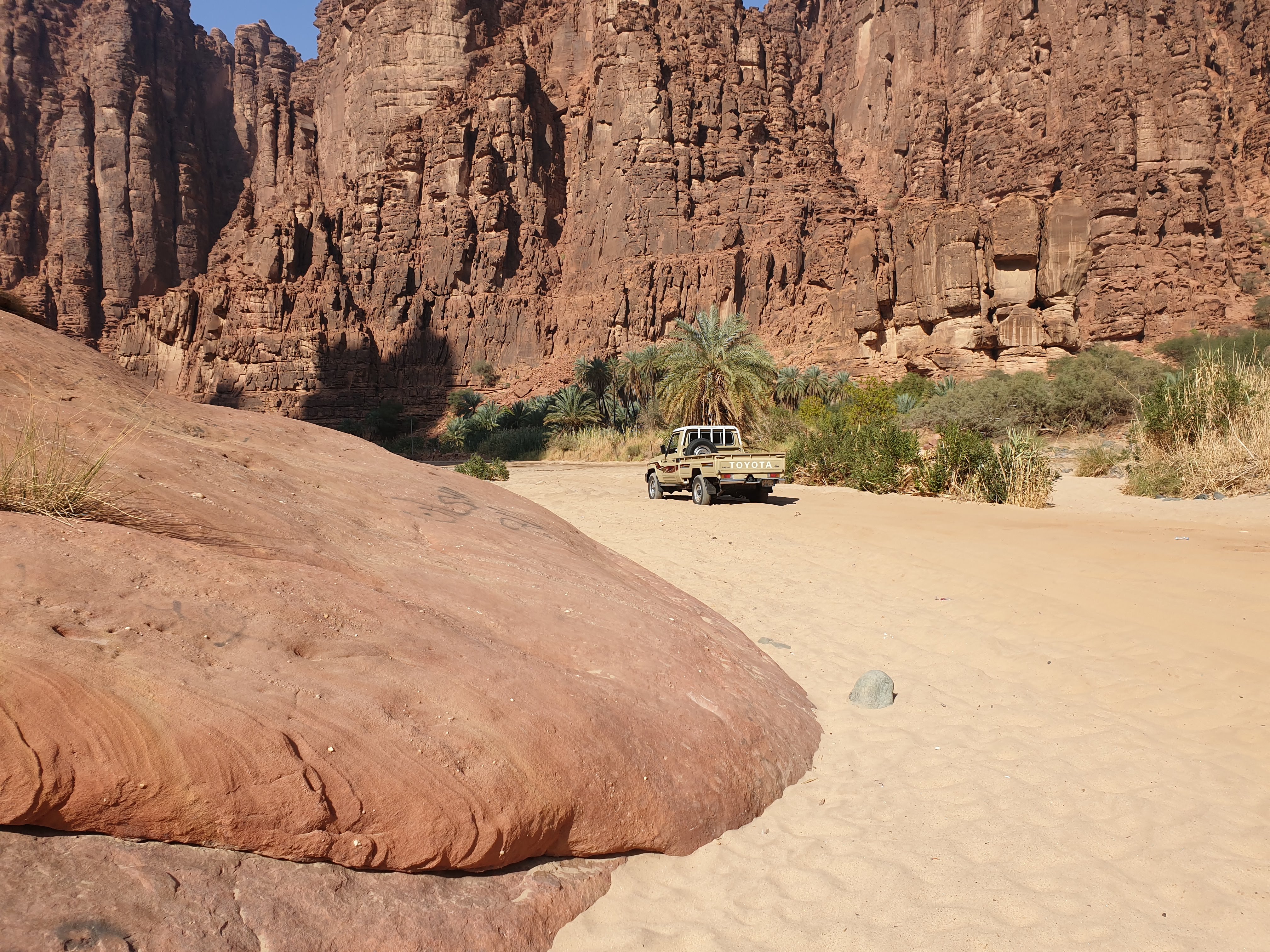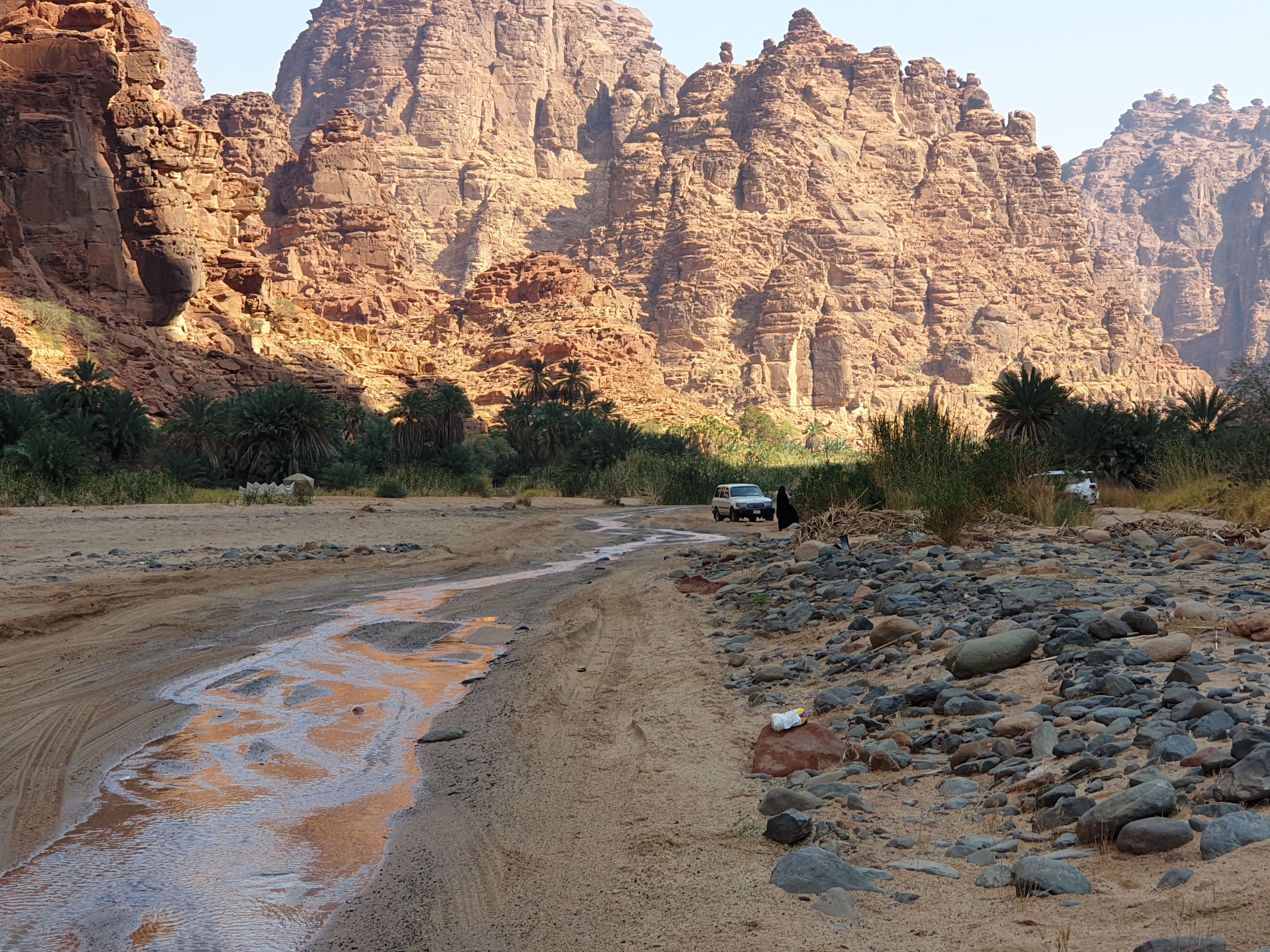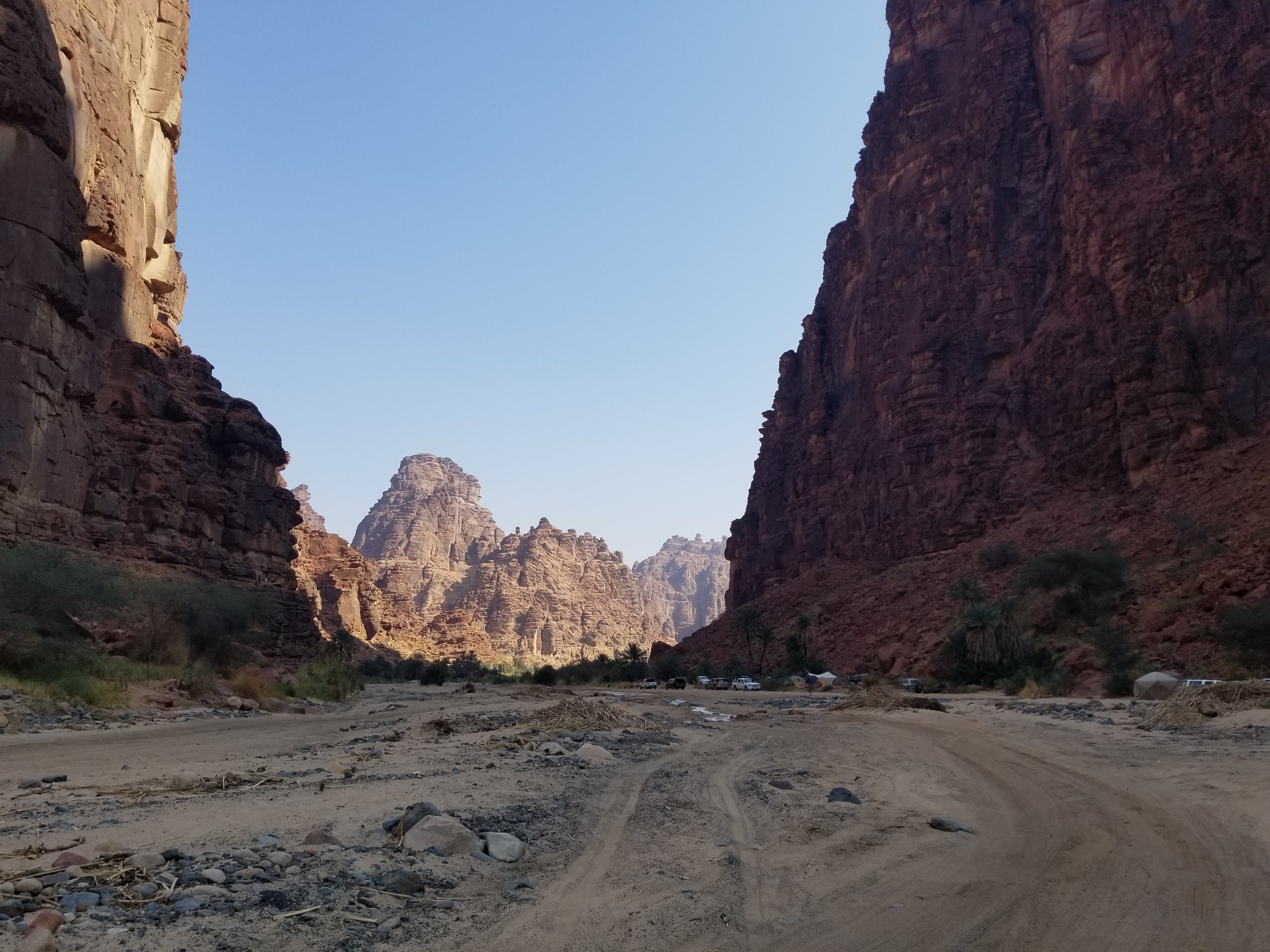 Waking up, my wonderful travel companion and I embarked on a 14+ hour drive through Hail, all the way to Tabuk. This drive showed us how the Saudi landscape can evolve from flat, sandy desert, to rolling hills and beautiful steep, rocky mountains. Our Budget rent-a-car vehicle dubbed “Timothy” held up nicely considering it’s failed attempt through the treacherous conditions near Edge of the World. On this trip, we saw our first of thousands of camels along the highways and side routes. Camels in Saudi Arabia are mostly owned but allowed to roam freely. The ones that are owned have hobbles (aka prison shackles) around their two front feet (camels do NOT have hooves, but rather two toes at the front of their feet). On several occasions, a shephard was leading the way on camel-back and behind him were over 50 camels following in synchrony. Thanks to Spotify and the one and only DJ Nicola as a copilot, we maintained some semblance of sanity during our trip and arrived in Tabuk ready for a night’s rest for the next day’s trip to Wadi Al Disah.
