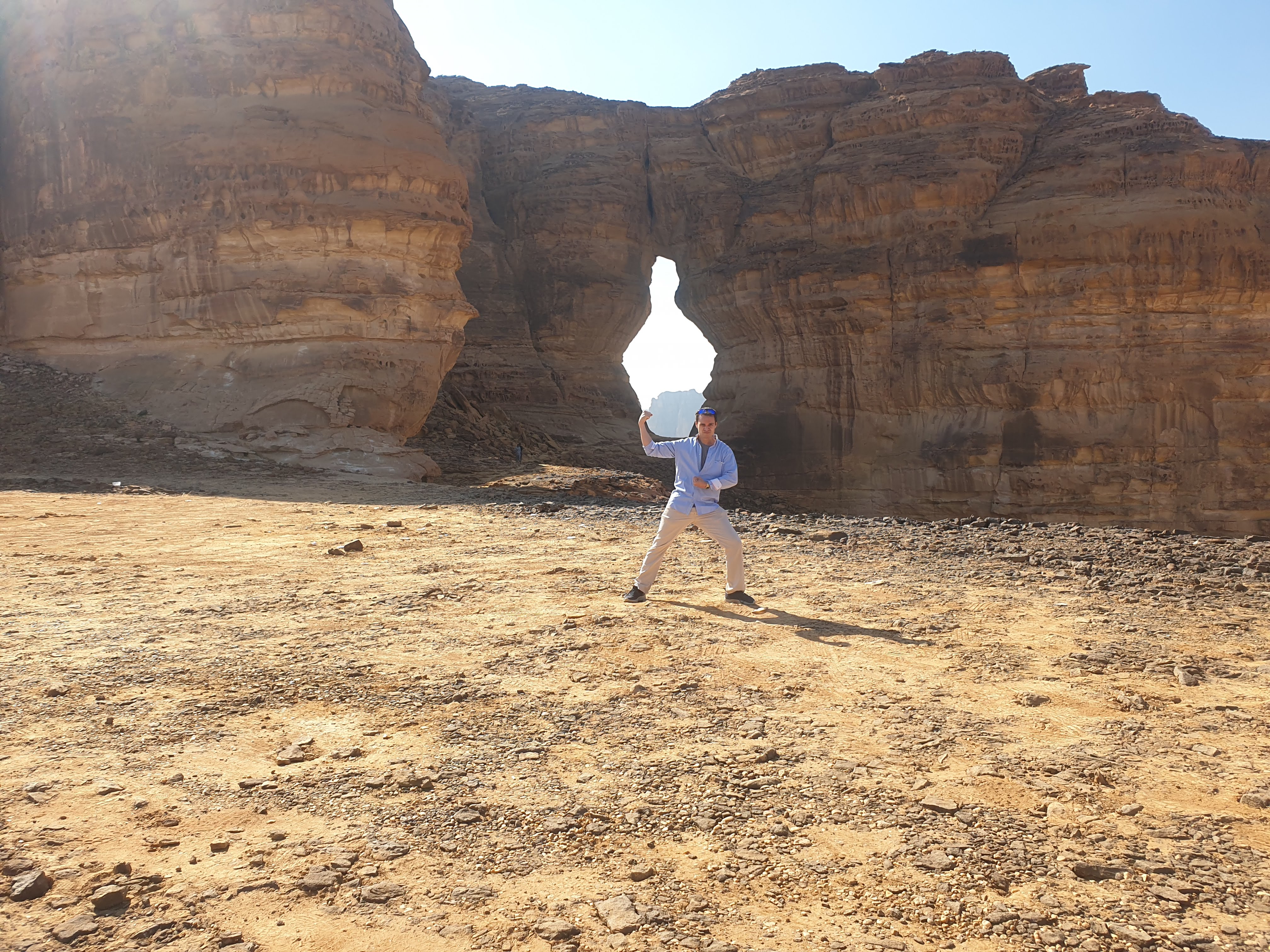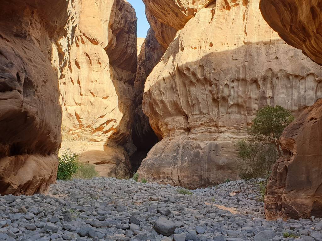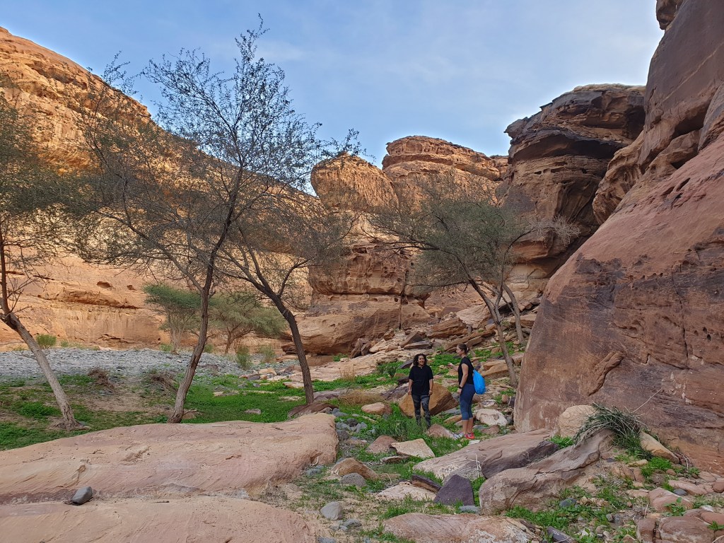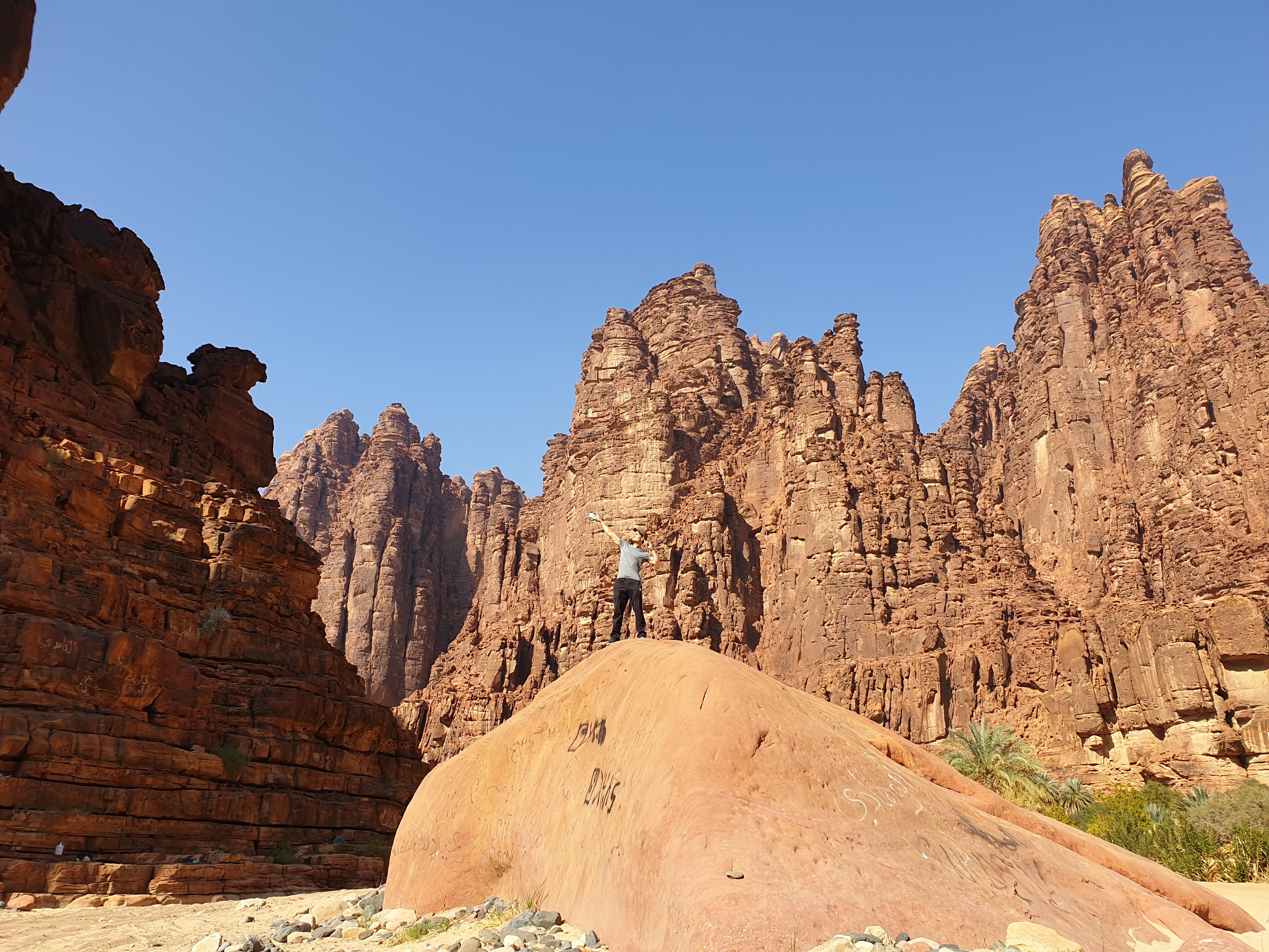 Unfortunately for us, the biking, and sunrise excursions were fully booked throughout the entire week. The tour around the Hegra circle was also fully booked and we had to extend our stay one extra day to ensure that we saw the main attraction: Mada’ain Saleh. There’s a lot of history within Al Ula. From the Bronze age, the Lihyanites (or Dadanites), the Nabataeans and Romans up until the Muslim Era, etchings on the rocks throughout the town make for new discoveries and conversation as you hike around the area. We decided on a sunset hike and our tour guides Rawa and Abdulrahman skillfully drove us through Locust storms and soft sand in their 4-by-4. There was no way our little Toyota rental was making it through that terrain so we were quite thankful that they drove us to the site of our hike. As it turns out, approximately half of the 2 hour hike wound through the seasonal river beds that fill up when it rains, and we hiked about and swam through several ponds of cool rain water, all the while learning about the 2,000+ year old inscriptions that surrounded us on the basaltic and limestone rocks. Due to the volcanic activity hundreds of years ago, there were copious basaltic and volcanic rocks. The symbols emblazoned on them depicted war scenes, mathematical computations and letters from the age of antiquity. It was a once-in-a-lifetime experience that was simultaneously educational and scenic. If you are interested in this type of activity, please visit Husak Adventures. Our tour guide, Rawa, recently graduated from UC-Davis and had a plethora of geological and historical facts to share with us about the surrounding ecosystem. This was a quality experience that I would recommend to anybody who’s willing to trek through some of the most beautiful nature this planet has to offer.