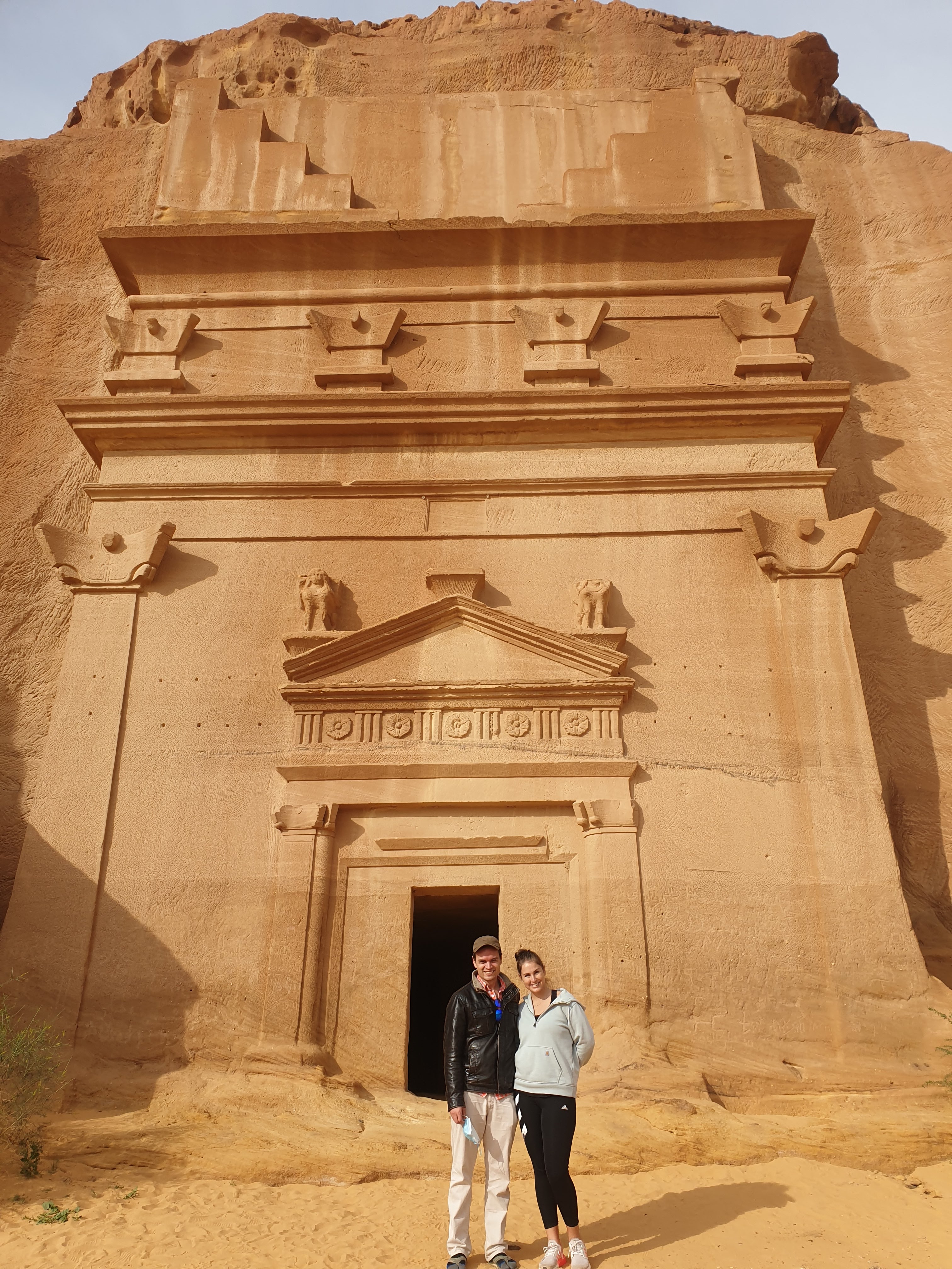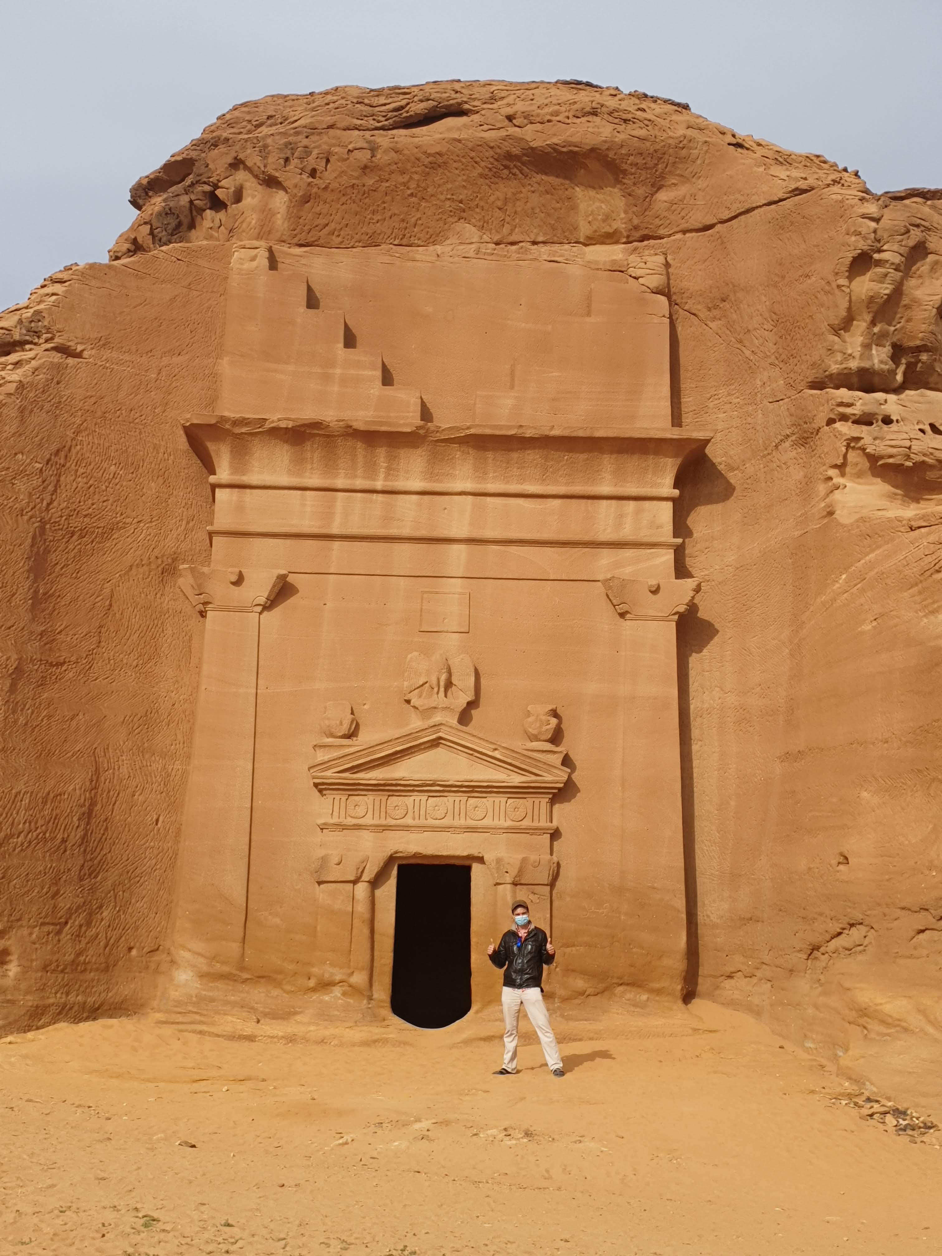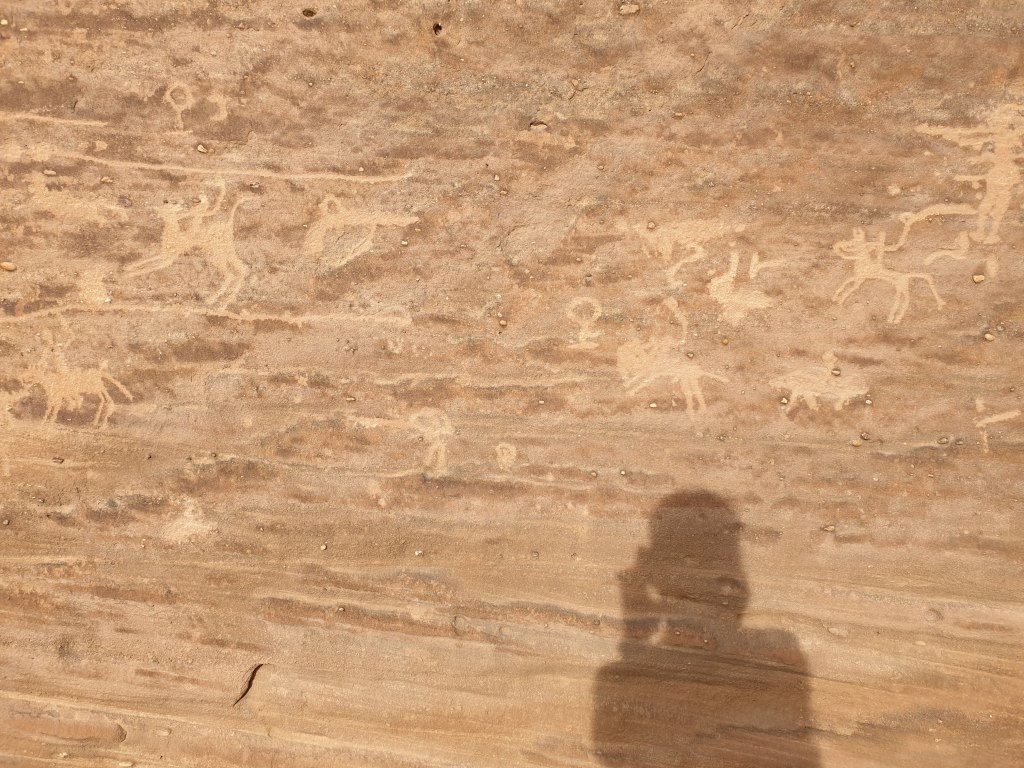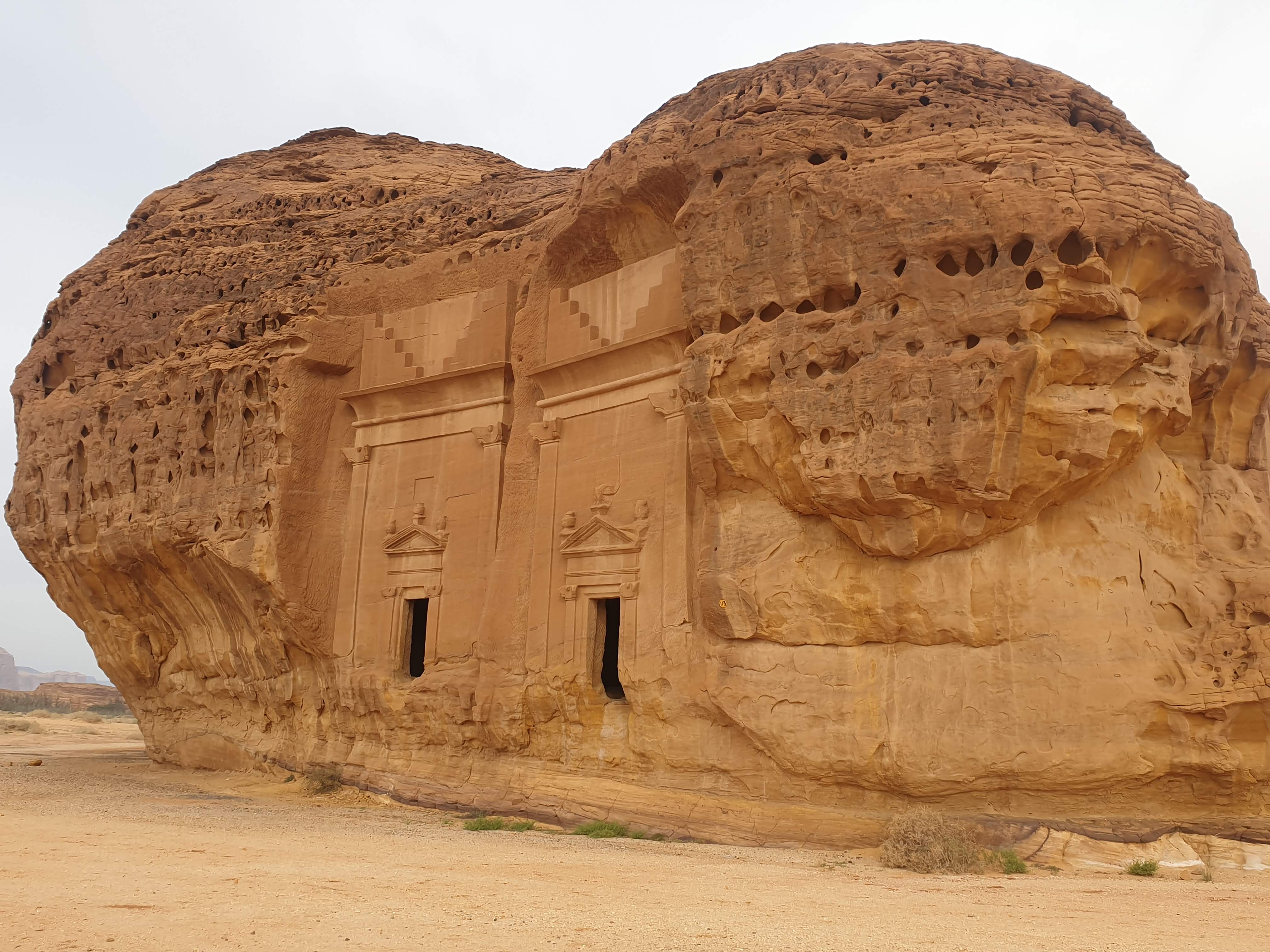 For our first full day in Al Ula, we decided to explore Dadandian tombs (including the infamous Lion’s tomb), the petroglyphs, hieroglyphs and the majestic rock formations in the greater Al Ula vicinity. There were several on the list, but Elephant rock and vase rock were highlighted most frequently so we went to those first. There are hundreds of tombs and most tour guides and archeologists agree that less than 5% of the historical sites have been discovered. The most noticeable tombs were cut into the rock face south of the Dadan historical site, a burial location that likely reflected the social position of the deceased. The grandeur of the Lion’s Tombs for instance probably reflected the the social status of the entombed.