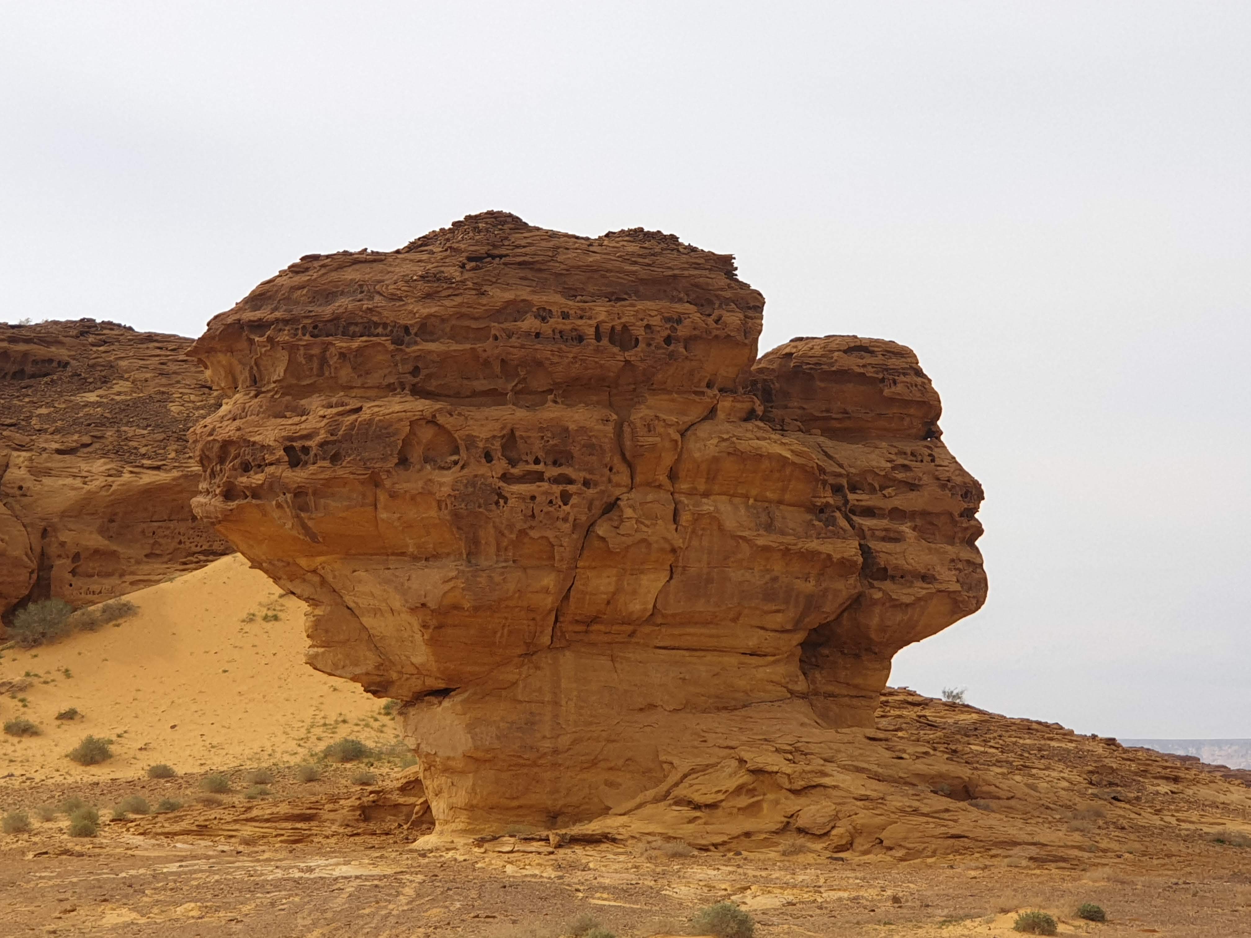 As we approached Al Ula, we passed several Orange stands and decided to help the local economy. We ended up buying 3 whole cases of oranges, one of them being Kumquats. They were locally grown in the surrounding Oasis territory and were delicious! The locals gave us several oranges to try on the spot and we couldn’t resist-fresh, oasis-grown oranges; a welcome surprise for any desert traveler. After strategically placing the foam orange cartons in the back seat, we continued on the path toward Al Ula. The limestone formations became more abstract and glancing at the GPS, I realized why. The names of the attractions include: elephant rock, four fingers rock, vase rock and several others.